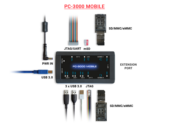 Besides, PC-3000 MOBILE has the extension ports for device-specific functionality and connection of add-on modules where voltage for all ports is supplied through an internal controllable power supply unit.